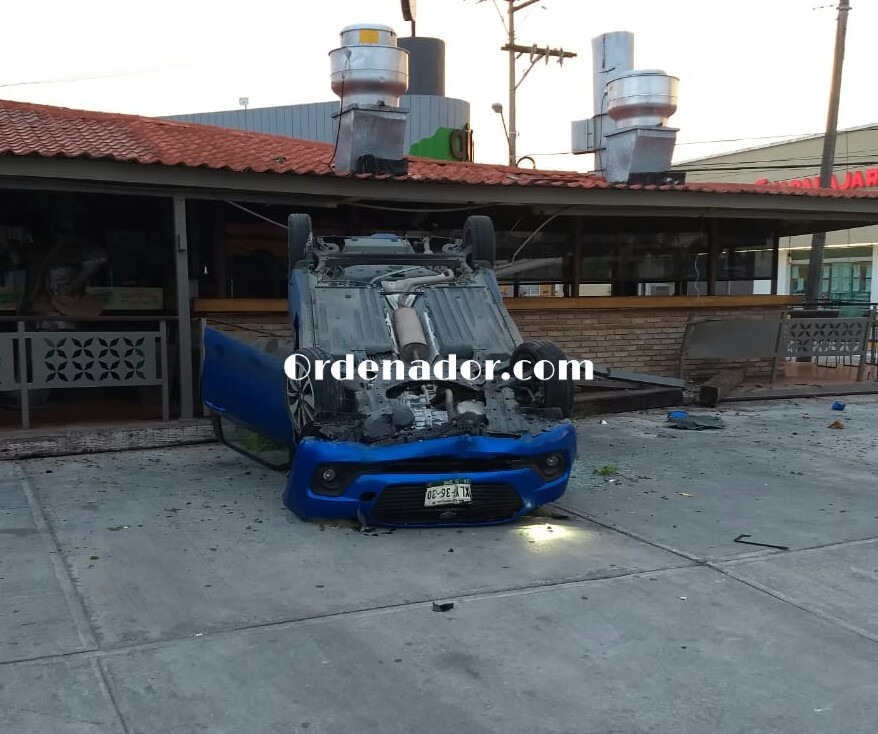 Tampico,Tamps. (9 Junio 2019)Volcado y a punto de introducirse a un restaurante quedó un automóvil compacto, cuyo imprudente conductor que además se dio a la fuga, perdió el control del volante al desplazarse con exceso de velocidad e impactar a una planta de ornato.