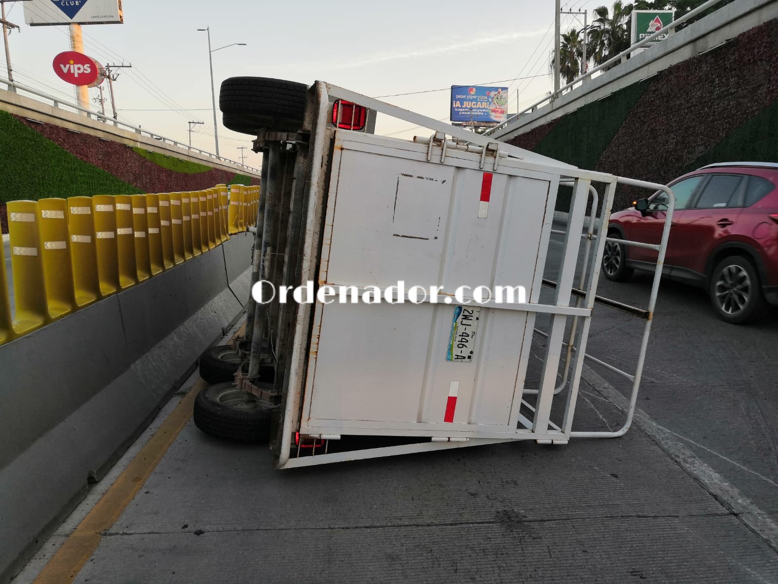 Al tomar una curva cargada en el Paso Inferior se zafó el remolque con matrícula 2WJ446A de Tamaulipas que por fortuna se encontraba vacío, quedando volcado sobre su costado derecho.