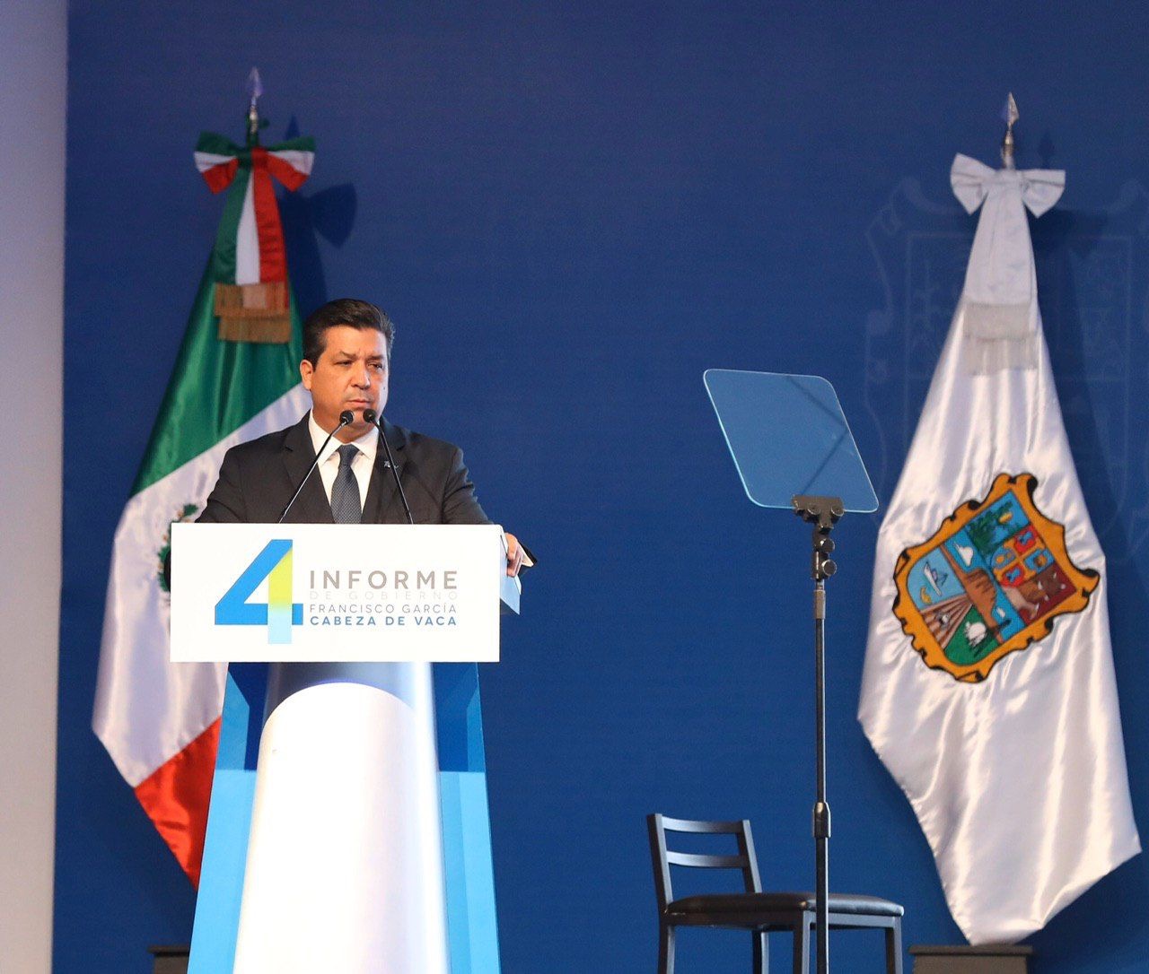 Ciudad Victoria, Tamaulipas.- El Gobernador, Francisco García Cabeza de Vaca, hizo entrega este sábado de su Cuarto Informe de Gobierno a los integrantes de la LXIV Legislatura del H. Congreso del Estado de Tamaulipas, y dirigió un mensaje a representantes de la sociedad civil de la entidad.