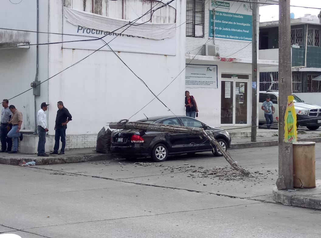 El vetusto poste de concreto cayó sobre el medallón de un carro de la marca Volkswagen Vento en color negro, mismo que se encontraba estacionado frente a las oficinas de procuración de justicia.
