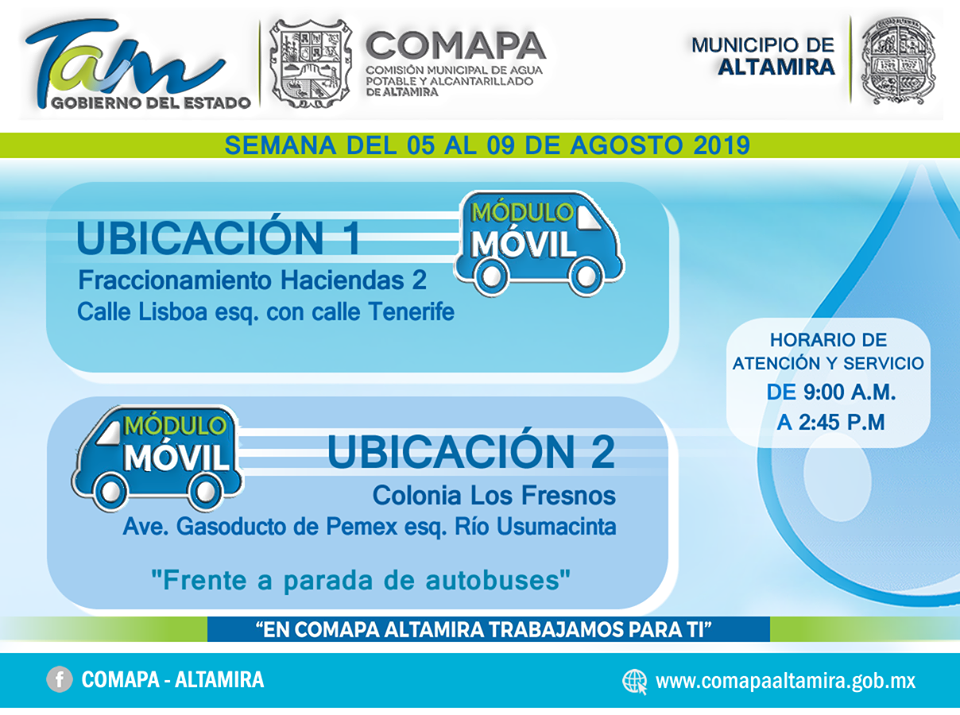 Altamira,Tamps. (5 Agosto 2019)La Comisión Municipal de Agua Potable y Alcantarillado en Altamira informa que el COMAPA Móvil se ubicará de la semana del 05 al 09 de agosto del 2019.