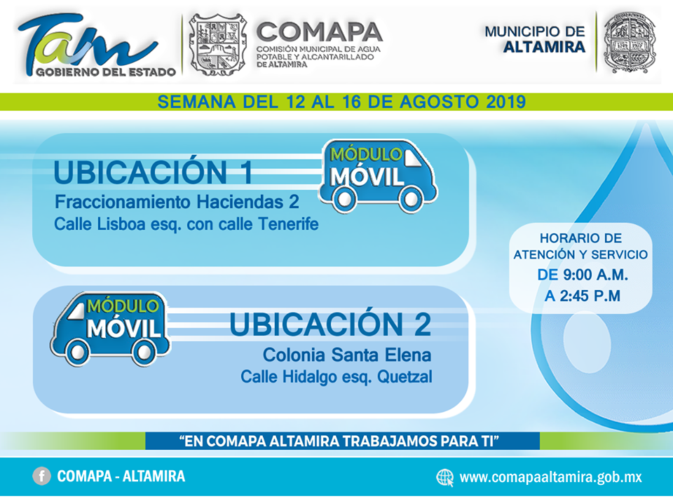 Altamira, Tamps. (12 Agosto 2019) La Comisión Municipal de Agua Potable y Alcantarillado en Altamira informa que el COMAPA Móvil se ubicará de la semana del 05 al 09 de agosto del 2019.