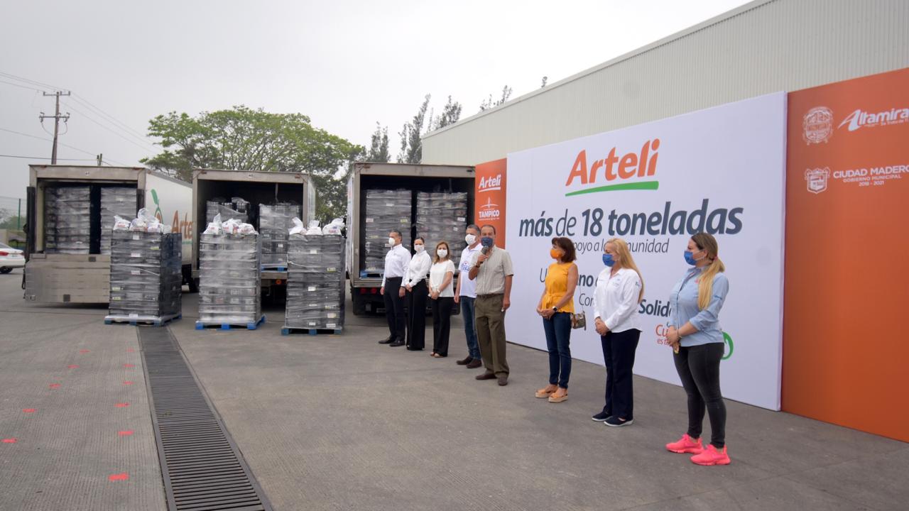 En este acto realizado en el Centro de Distribución de Arteli, se formalizó por parte de esta empresa la entrega a los Sistemas DIF de Altamira, Tampico y Madero, de más de 18 toneladas de apoyo a la comunidad.