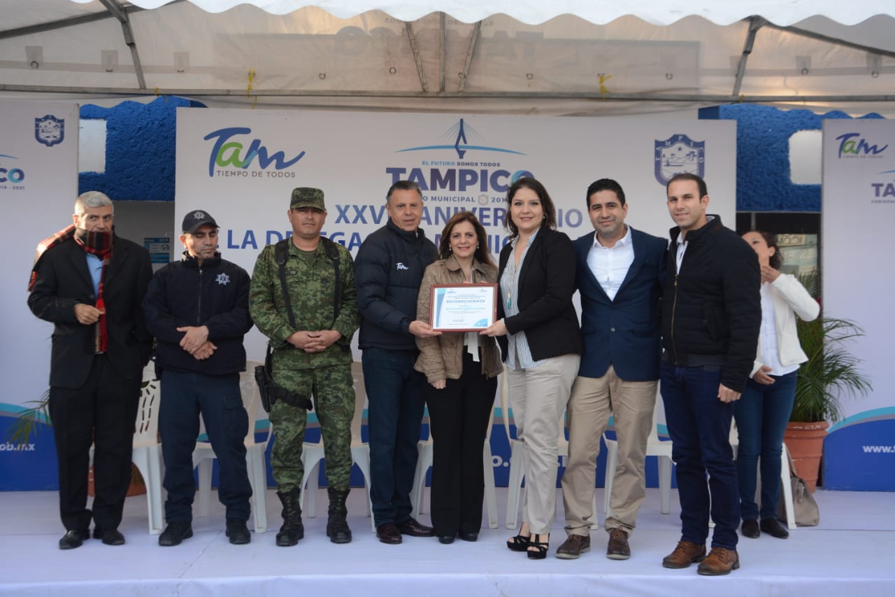 Tampico,Tamps. (29 Enero 2019)El Presidente municipal Chucho Nader y su esposa, la Presidenta del sistema DIF Tampico, Sra. Aida Feres de Nader encabezaron la ceremonia conmemorativa del XXVIII Aniversario de la Delegación municipal de la zona norte, efectuado en la explanada de este espacio de gobierno.