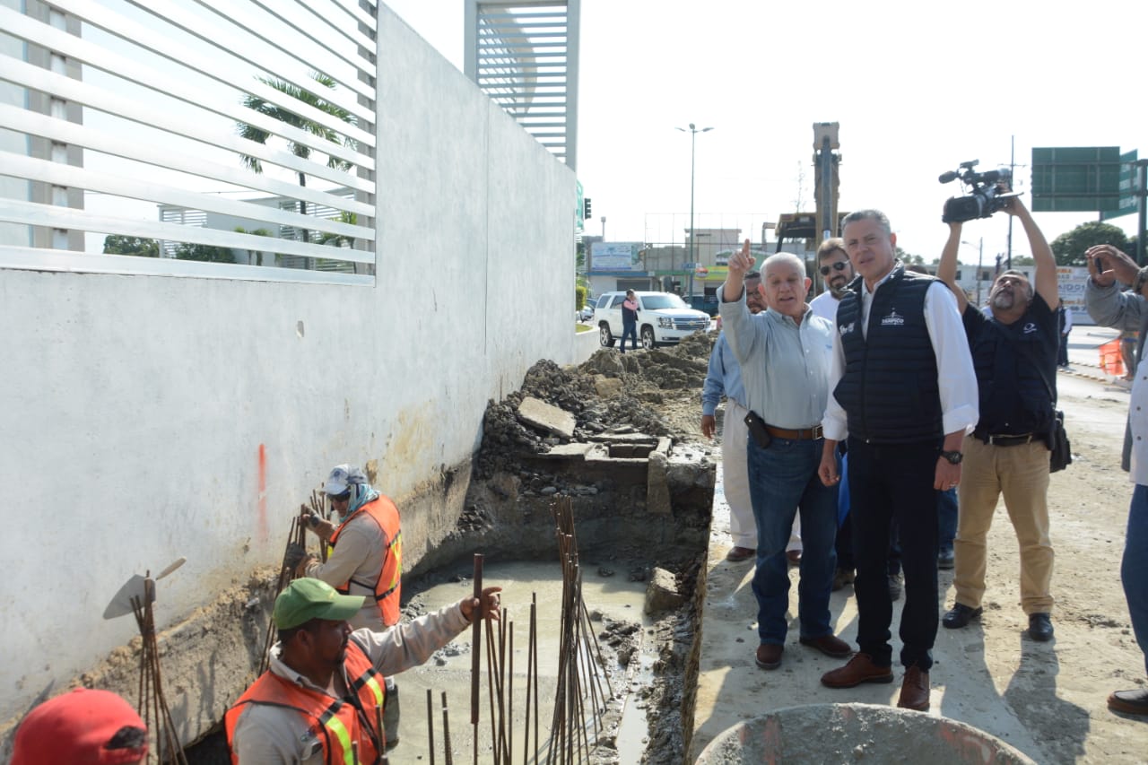 Tampico,Tamps. (14 Febrero 2019)El Presidente municipal Chucho Nader acompañado por el Secretario de Obras Públicas, Pedro Pablo Rangel Cerrillo efectuó la supervisión de los trabajos de construcción de un moderno dren pluvial que la administración porteña lleva a cabo en el bulevar perimetral y su intersección con el bulevar Adolfo López Mateos a la altura de la Escuela Náutica Mercante.