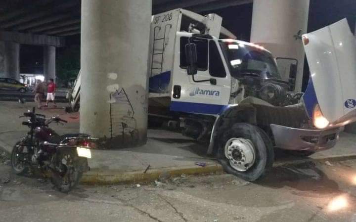 La pesada unidad se desplazaba a exceso de velocidad quedando incrustado entre los soportes del paso a desnivel sobre el boulevard Allende , por fortuna no hubo vehículos, ni personas lesionadas por esta incompetencia del chófer de la unidad.