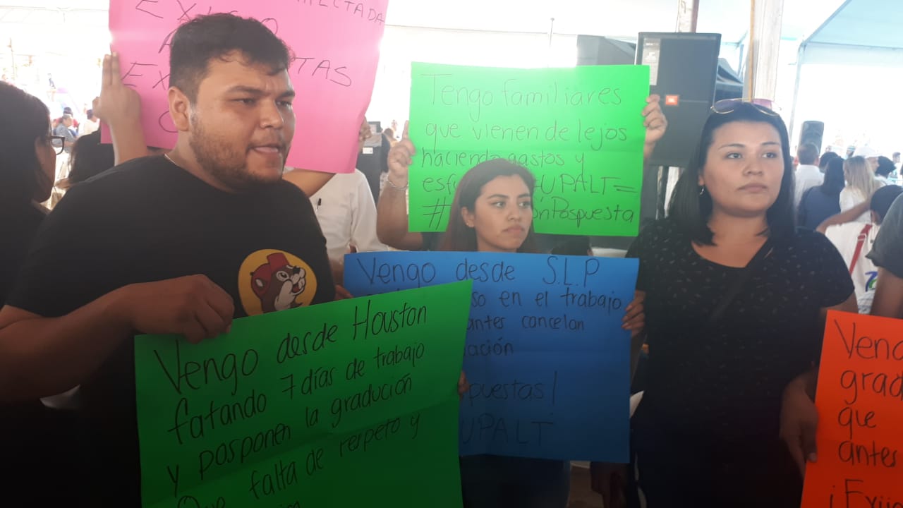 Un grupo de estudiantes de carreras como Telecomunicaciones y Electrónica, algunos ya contratados por empresas, explican que después dd solicitar permiso en sus trabajos, pagar boletos de avión para ellos y sus familias entre otros gastos importantes, la directiva de la upalt de un día para otro les canceló la ceremonia de graduación.