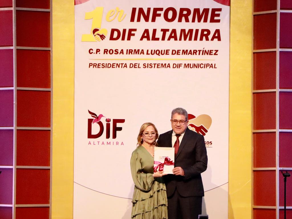 Altamira, Tamaulipas. (8 Octubre 2022)Cumpliendo con sus compromisos de corazón y generando mayor bienestar entre las familias altamirenses, la presidenta del Sistema DIF Altamira, C.P. Rosa Irma Luque de Martínez, rindió su Primer Informe de Actividades donde destacó los resultados que se han logrado en materia de salud, alimentación, inclusión social, así como apoyos a mujeres, adultos mayores, niños, jóvenes y grupos vulnerables.
