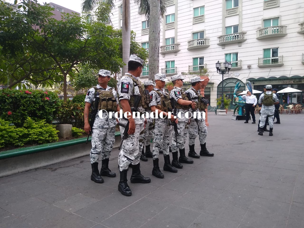 Tampico,Tamps. (27 Noviembre 2019 ) Diariamente por las mañanas, a la plaza de Armas llegan cerca de 30 elementos de la Guardia Nacional con uniformes nuevos quienes redoblan los operativos de recorridos a pie por el centro de Tampico para inhibir delitos que afecten a peatones y negocios.