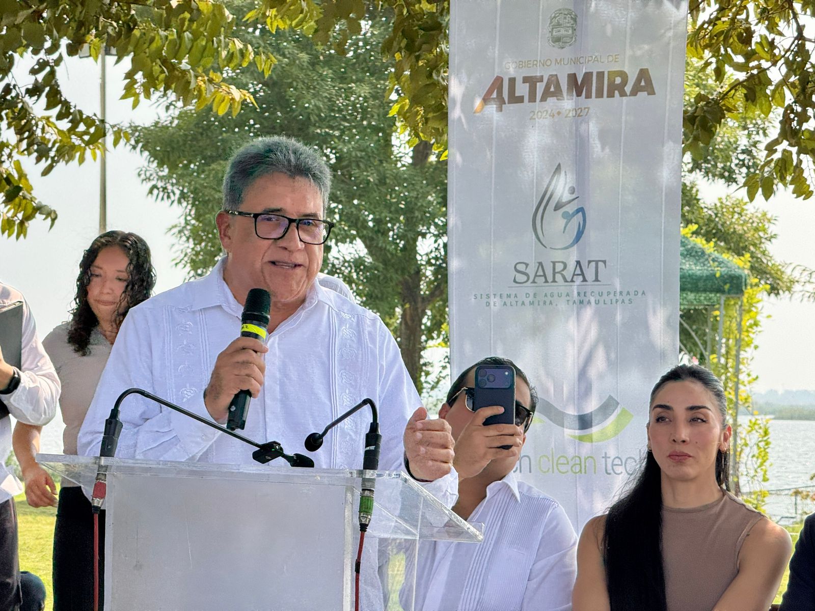 Durante la ceremonia participaron igualmente representantes del Sistema de Aguas Recuperadas de Altamira Tamaulipas (SARAT): el Ing. Bulmaro Delgado Baena, el Dr. Moisés Rebollar Barceló y Mónica Guagnelli Martínez, además del Dr. Gabriel Arcos Espinoza, gerente general de COMAPA Altamira.
