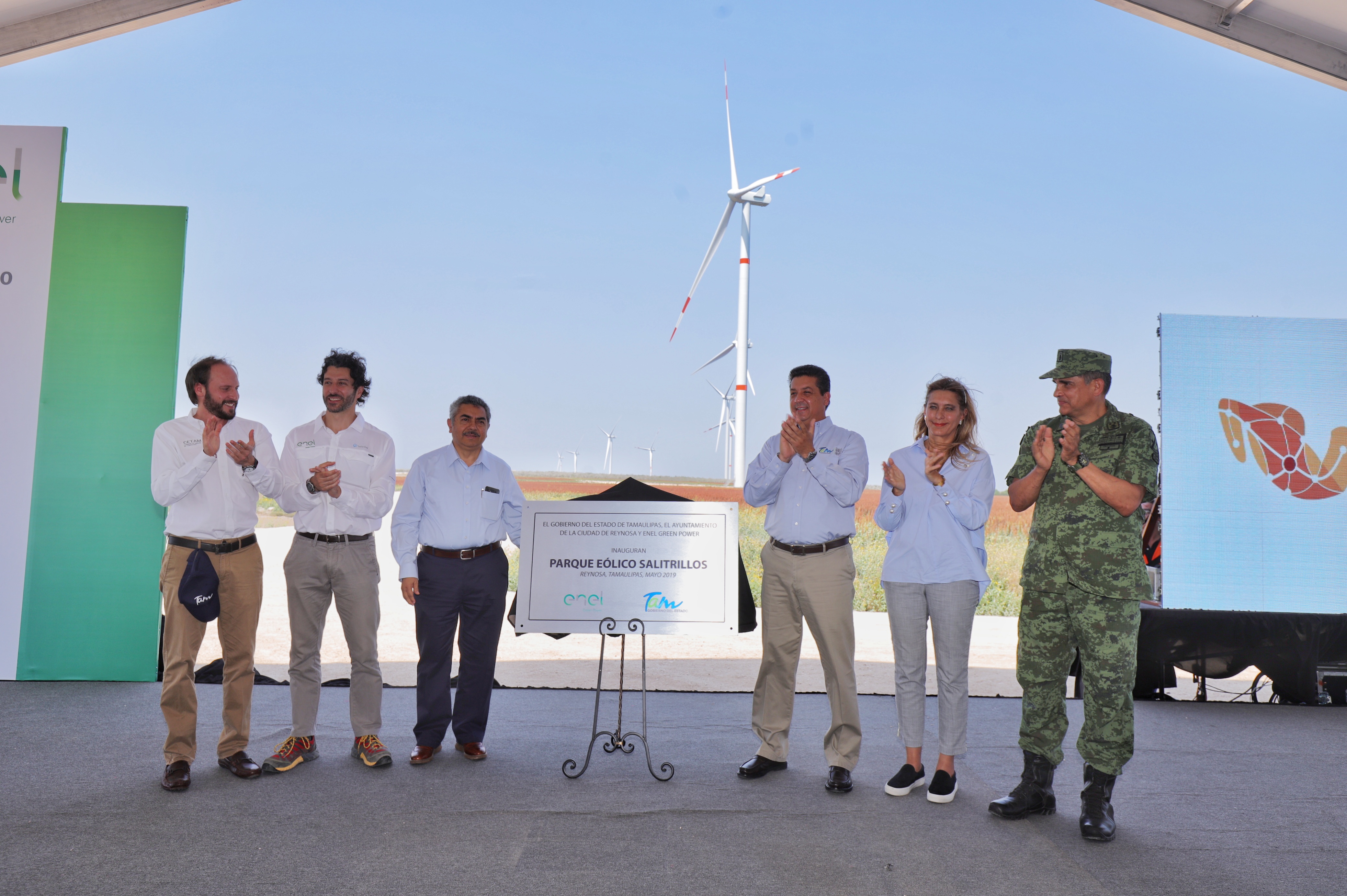 Reynosa, Tamaulipas.- El gobernador Francisco García Cabeza de Vaca, el subsecretario de Energía del Gobierno de México, Miguel Ángel Maciel Torres y Paolo Romanacci, Director General para México y Centroamérica de ENEL Green Power, empresa internacional dedicada el desarrollo y operación de energías renovables, inauguraron en Reynosa el Parque Eólico “Salitrillos”, conformado por 30 aerogeneradores con capacidad para la producción de 103 MWh (megawatts/hora), equivalentes al consumo de energía eléctrica de 200 mil hogares mexicanos.