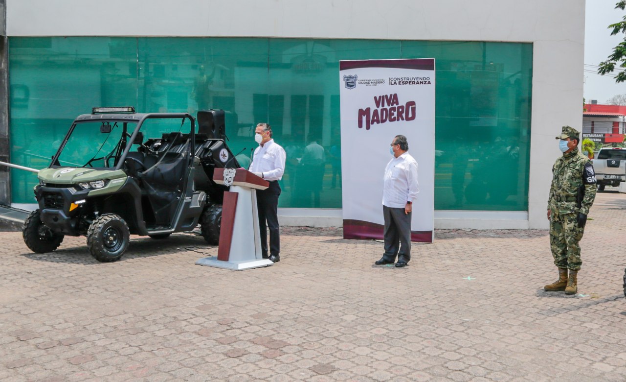 El acto protocolario tuvo lugar en la explanada del Ayuntamiento Municipal, donde la primera autoridad acompañado del Secretario del Ayuntamiento, Juan Antonio Ortega Juárez, manifestó: “Hoy los maderenses contamos con el respaldo y la seguridad que nos brinda el personal de la Guardia Nacional, y para corresponder a su invaluable labor, entregamos en una primera etapa estas dos unidades Razors, de las 10 que otorgaremos y que vendrán a reforzar las tareas de vigilancia ya que serán distribuidas en puntos estratégicos de la ciudad”.