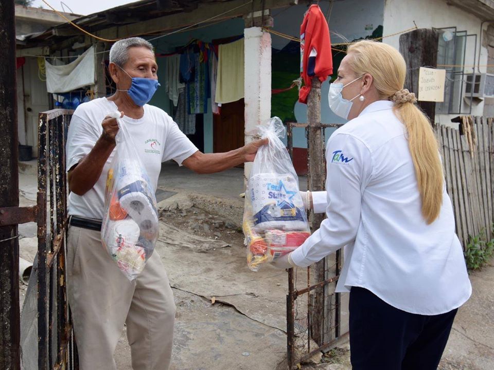 En atención a lo establecido en el programa Adulto Activo y cumpliendo con las medidas de higiene exigidas por la Secretaría de Salud en Tamaulipas, la presidenta municipal Alma Laura Amparán Cruz efectuó casa por casa la entrega de despensas a adultos mayores beneficiados con ese esquema en la colonia Felipe Carrillo Puerto, comprendida en la Zona Carretera Tampico-Mante.