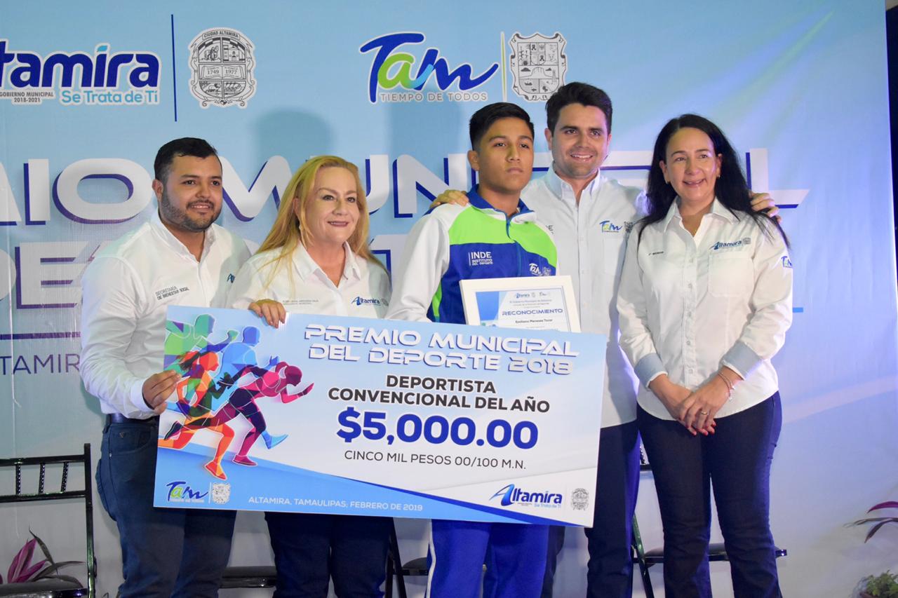 Altamira,Tamps. (23 Febrero 2019)Refrendando su firme compromiso con el deporte y los deportistas de Altamira, la presidenta municipal Alma Laura Amparán Cruz, acompañada del director general del Instituto del Deporte en Tamaulipas, Carlos Fernández Altamirano, entregó el Premio Municipal del Deporte 2018 al taekwondoín altamirense Emiliano Meneses Tovar (deportista convencional), por su destacada participación en competencias en diferentes ámbitos de esa especialidad.