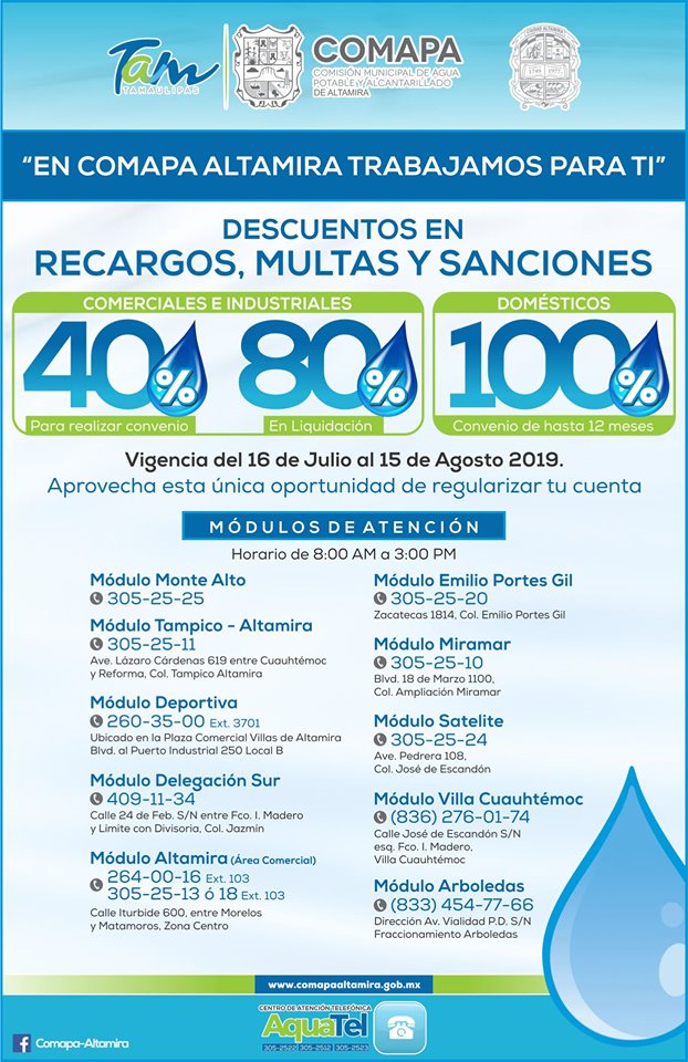 Este 15 de Agosto concluye programa de descuento COMAPA Altamira