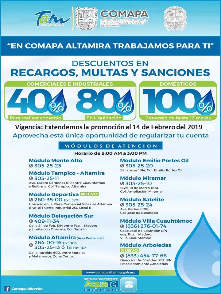 Altamira,Tamps. (8 Febrero 2019)La Comisión Municipal de Agua Potable y Alcantarillado informa sobre sus descuentos en recargos sanciones y multas un 40% para realizar convenio, un 80% en liquidación y un 100% en tomas domésticas con convenio hasta de 12 meses.
