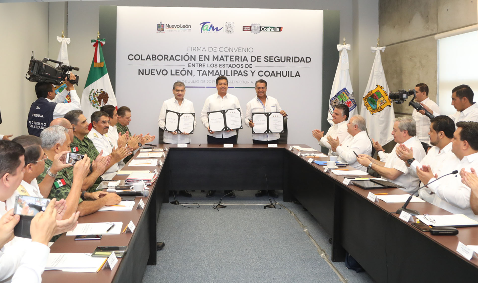 Ciudad Victoria, Tamaulipas.- (10 Julio 2019)Los gobernadores Francisco García Cabeza de Vaca, de Tamaulipas; Miguel Ángel Riquelme Solís, de Coahuila; y Jaime Rodríguez Calderón, de Nuevo León; firmaron hoy en la capital tamaulipeca un convenio de colaboración en materia de seguridad pública, a fin de contribuir con la preservación del orden público y la paz en la región.