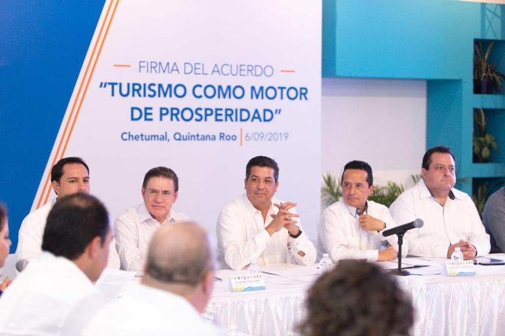 Chetumal, Q. Roo. - En calidad de Presidente de la Asociación de Gobernadores de Acción Nacional (GOAN), el Gobernador, Francisco García Cabeza de Vaca, firmó hoy en esta capital el acuerdo “Turismo como Motor de Prosperidad”, mecanismo que busca impulsar un desarrollo equilibrado e incluyente basado en infraestructura y proyectos de inversión para fortalecer los segmentos turísticos.