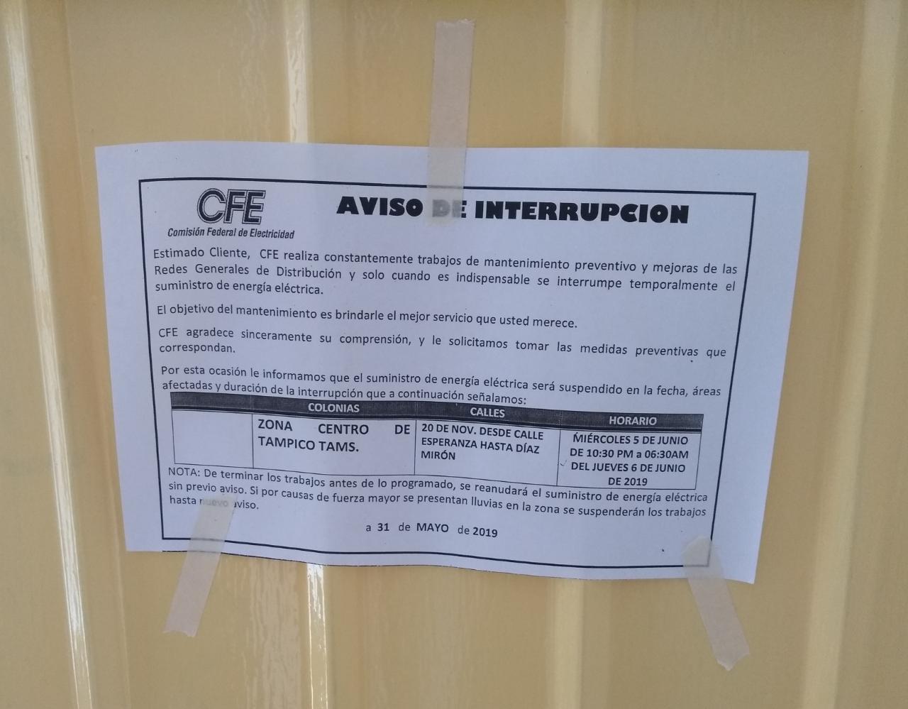 Tampico,Tamps. (5 Junio 2019)A través de un aviso enviado a comerciantes y residentes del primer cuadro de Tampico, la Comisión Federal de Electricidad notificó la suspensión del servicio desde la calle 20 de noviembre entre Esperanza y Díaz Mirón hoy por la noche.