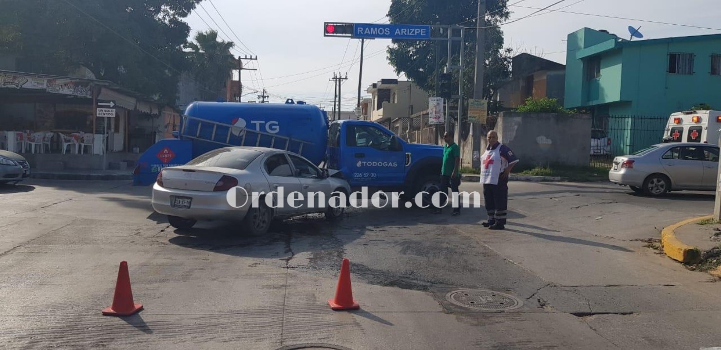 En el punto una auto-pipa color azul propiedad de la empresa Todo-Gas, fue impactada en un costado por un carro Dodge de la línea Neón color gris, placas de circulación del estado de Tamaulipas, vehículo en el que uno de sus tripulantes resultó lesionado y fue atendido en el lugar de los hechos por socorristas de la Cruz Roja.