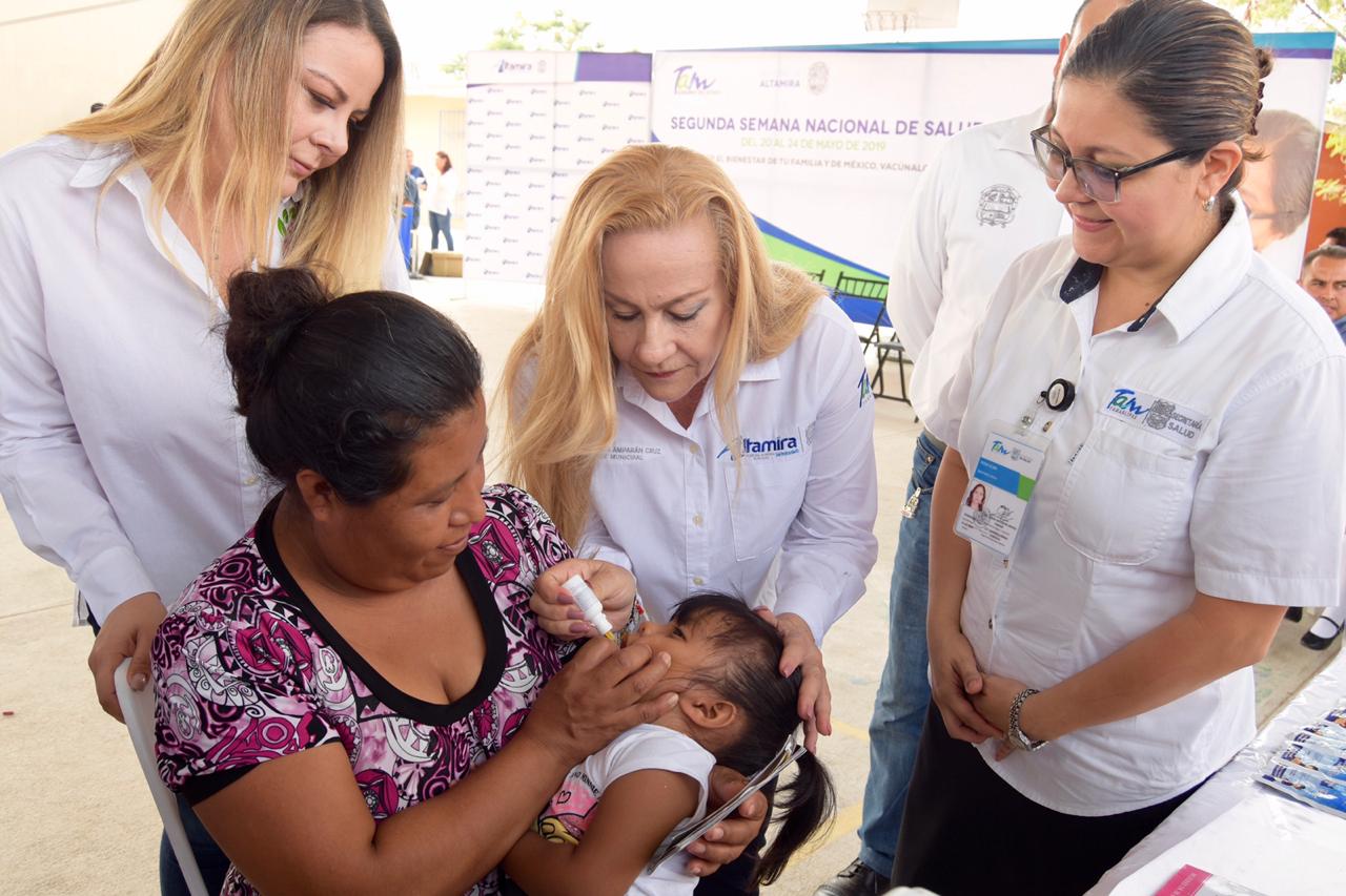 Contribuyendo a que la población infantil de Altamira esté libre de enfermedades, Amparán Cruz procedió al suministro de vitamina A y de las vacunas VPH (virus papiloma humano) y TDPA (refuerzo contra difteria, tétanos y fracción acelular de pertussis), además de entregar sobres de vida suero oral y albendazol.
