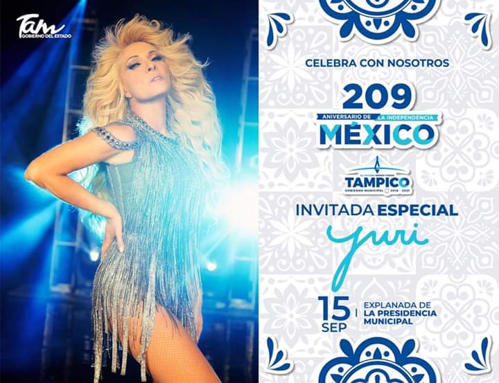 Tampico,Tamps. (12 Septiembre2019) Tampico celebrará el 209 aniversario del “Grito de la Independencia de México” en el Palacio Municipal. Para engalanar la noche en la que se espera una gran afluencia de personas, se presentará la cantante Yuri, reconocida por una trayectoria artística de más de 40 años que la ha llevado a escenarios nacionales e internacionales.