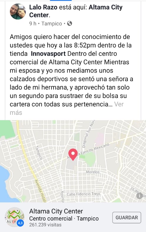 Tampico, Tamps.- (15 Enero 2020 ) A través de redes sociales un cliente de una tienda deportiva en el centro comercial "Altama" denunció haber sido víctima de robo de tarjetas bancarias así como de un equipo de telefonía celular.