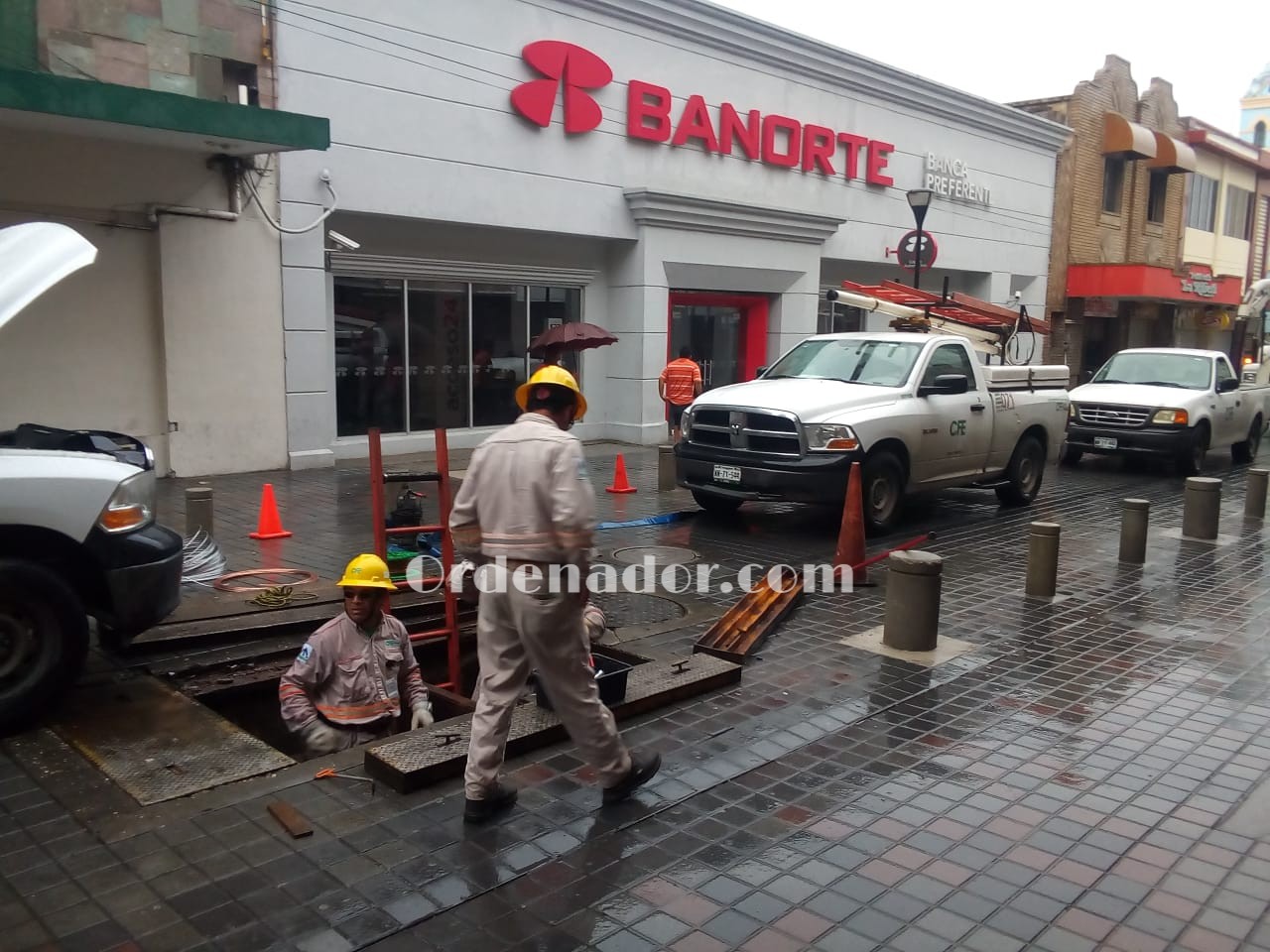 Cuando menos tres cuadrillas de trabajadores de la CFE arribaron poco después de las 8 de la mañana a la calle Carranza entre Olmos y Juárez en dónde fue necesaria la presencia de un camión vactor de la Comisión de Agua Potable y Alcantarillado Conurbada para desazolvar la red eléctrica que se encontraba anegada y dificultaba la tarea del personal de CFE.