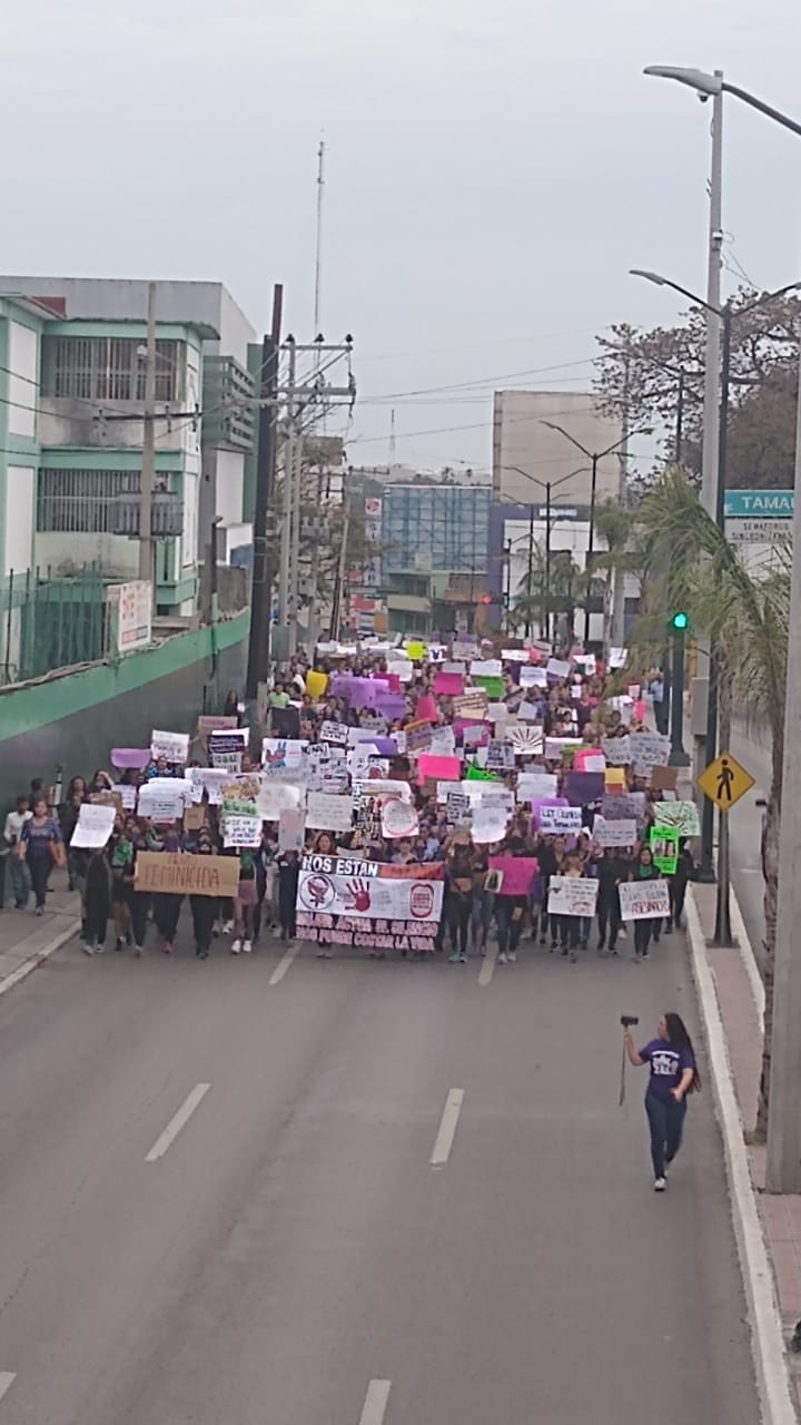 Tampico,Tamps. (8 Marzo 2020 ) En la marcha convocada hoy por colectivos feministas en el marco del "Día Internacional de la Mujer" la avenida Hidalgo de Tampico, principal arteria de la ciudad fue tomada pacíficamente por féminas de todas las edades para exigir un alto a la violencia de género y justicia en los casos de feminicidio que se han registrado en el sur de Tamaulipas y la región.