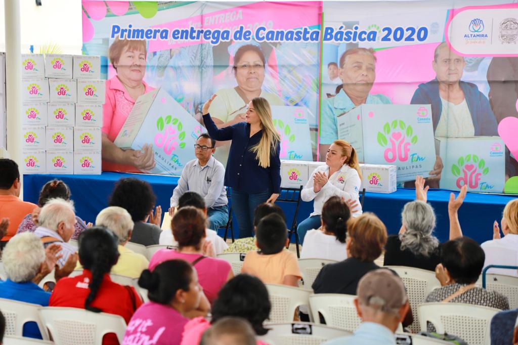 Altamira,Tamps. (12 Marzo 2020 ) Contribuyendo a una mejor alimentación de la sociedad más vulnerable como lo son los adultos mayores y personas con discapacidad, la presidenta del Sistema DIF Altamira, Alma Laura Hernández Amparán encabezó la primera entrega del programa “Canasta Básica”, en coordinación con el DIF Tamaulipas para beneficiar a mil 746 personas.