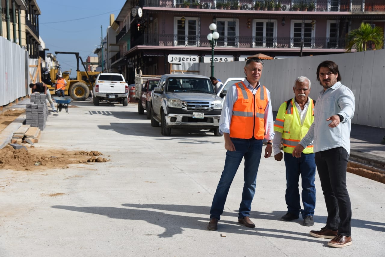 Tampico,Tamps.-. (4 Diciembre 2019 ) Al efectuar la supervisión de los trabajos de pavimentación que se llevan a cabo en la calle Benito Juárez, entre Francisco I. Madero y Héroes del Cañonero del centro histórico, el Presidente Municipal Chucho Nader anunció que la inauguración y reapertura de esta vialidad se efectuará en los próximos días.