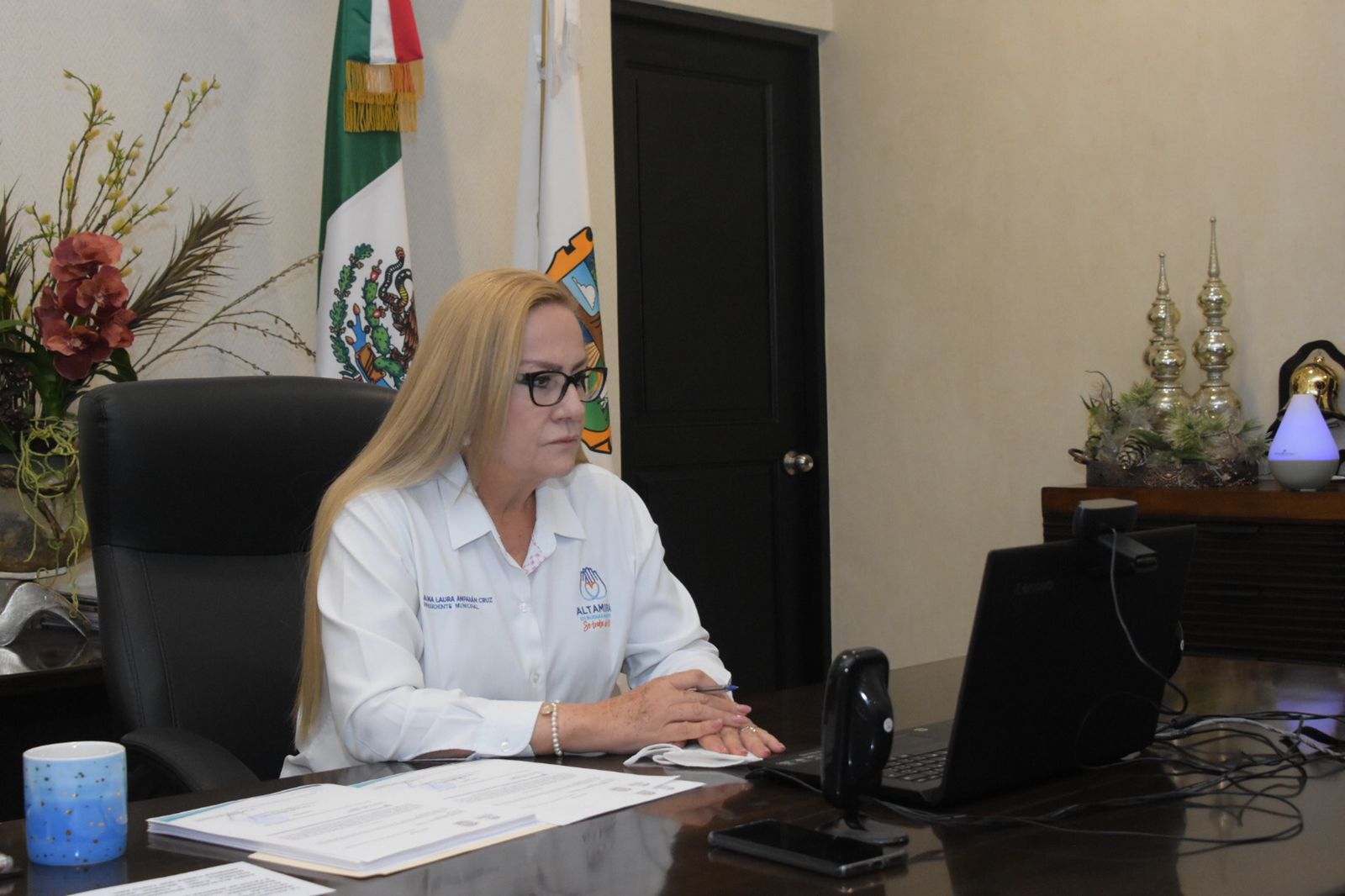 Altamira,Tamps. (11 junio 2021)La presidenta municipal de Altamira, Alma Laura Amparán Cruz, participó en la Mesa de Seguridad y Justicia del Sur de Tamaulipas, por medio de plataforma zoom, la cual fue encabezada por el gobernador del Estado, Francisco García Cabeza de Vaca.