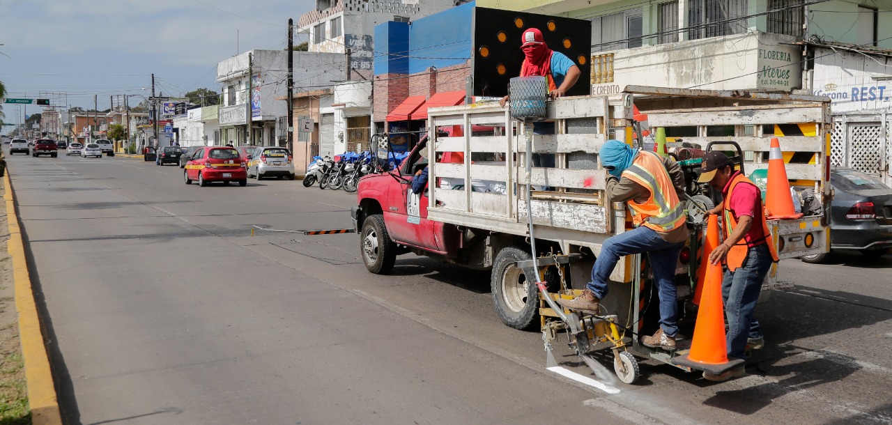Cd. Madero, Tamps. (14 Marzo 2022)Personal de Ingeniería Vial de la Dirección de Tránsito de Ciudad Madero, inició un programa de aplicación de pintura de líneas divisorias de carriles de circulación vehicular, aumentando la seguridad de los peatones.