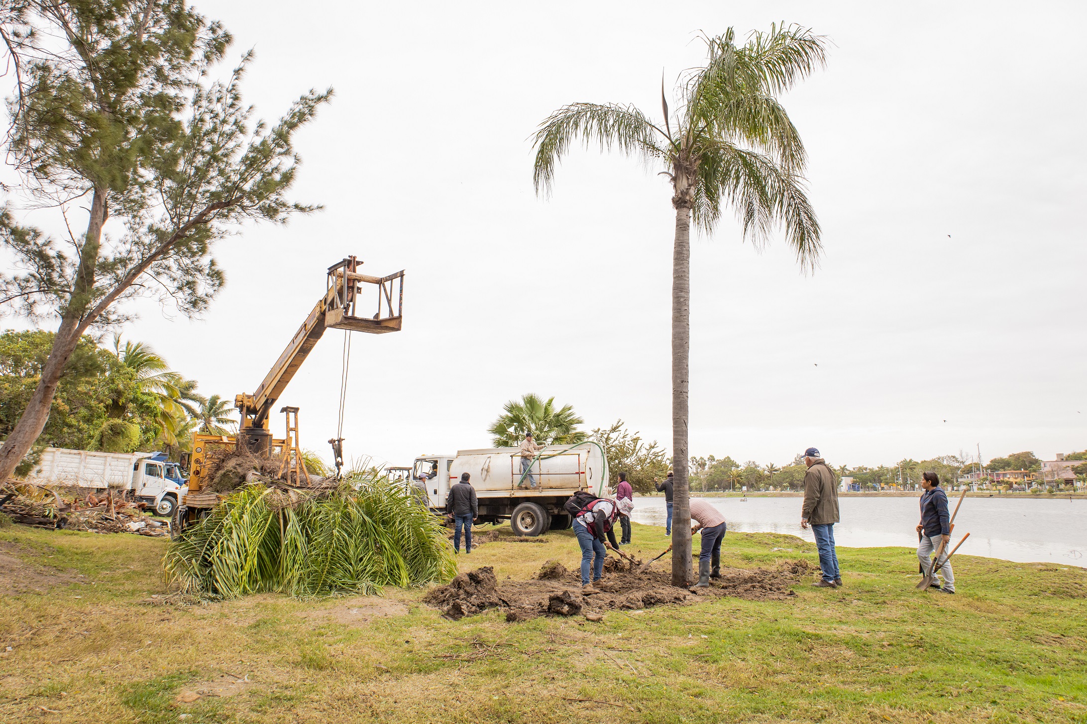 En ese tenor, el Presidente Municipal acompañado por el director de Servicios Públicos, Zamir Shahin Zamudio y el director general de Obras Públicas, Luis Carlos Leal Contreras, realizó una supervisión de las labores efectuadas en este cuerpo lagunario, donde fueron sembradas palmeras del Vivero Municipal.