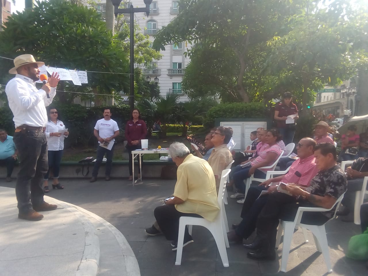 Uno a uno, los asistentes emitían palabras de apoyo a López Obrador; se encontraban: el regidor maderense, Mario Mar; el activista, Julio César López; Agustín Devesa Roca, simpatizante de MORENA manifestaron que aunque en la plaza de Armas habían pocas personas reunidas, en el país son 30 millones de mexicanos que respaldan las decisiones de López Obrador.