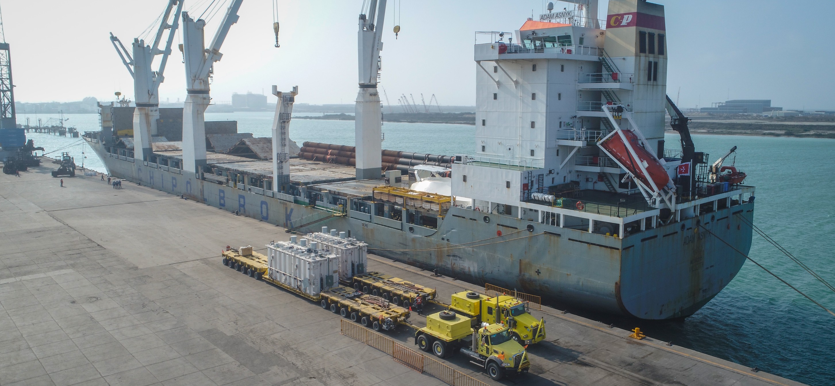 Estas impresionantes estructuras ingresaron al Puerto de Altamira en el Buque ADAM ASNYK misma embarcación que llego primeramente a la terminal de ATP para realizar la descarga de sus 3 nuevas grúas RTG y después de más 48 horas de operación de descarga continuo su cambio de muelle a la terminal de IPA STEEL para realizar la descarga de los trasformadores; el primer trasformador pesa 135 toneladas con destino a Hueyotlipan Tlaxcala; el segundo trasformador pesa 160 toneladas con destino a China Nuevo León; ambas super estructuras son provenientes de Shanghai, China.