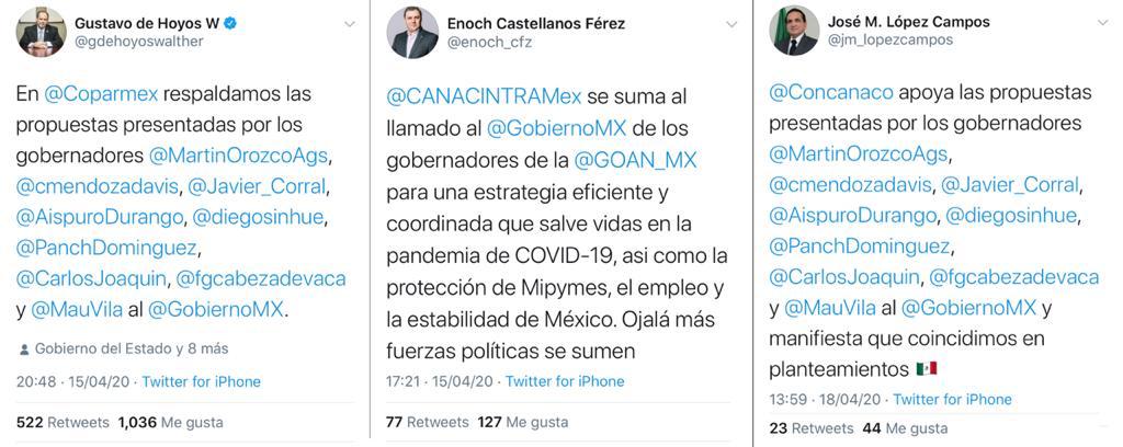 Gustavo de Hoyos Walther, Presidente de la Confederación Patronal de la República Mexicana (COPARMEX); Enoch Castellanos Férez, Presidente de la Cámara Nacional de la Industria de Transformación (CANACINTRA); y José Manuel López Campos, Presidente de la Cámara Nacional del Comercio (CANACO); se sumaron al llamado de los gobernadores agrupados en la GOAN hacia el Gobierno de México, para reactivar la economía nacional y preservar el empleo.