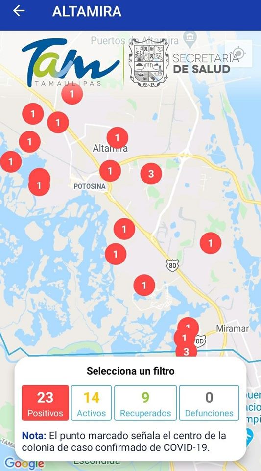 Atamira,Tamps. (6 Mayo 2020)La secretaría de salud de gobierno del estado dio a conocer que en Altamira existen 15 colonias de riesgo por contagio de coronavirus, es por este motivo que durante esta semana se arrancó con el programa de sanitización en el mismo número de sectores.