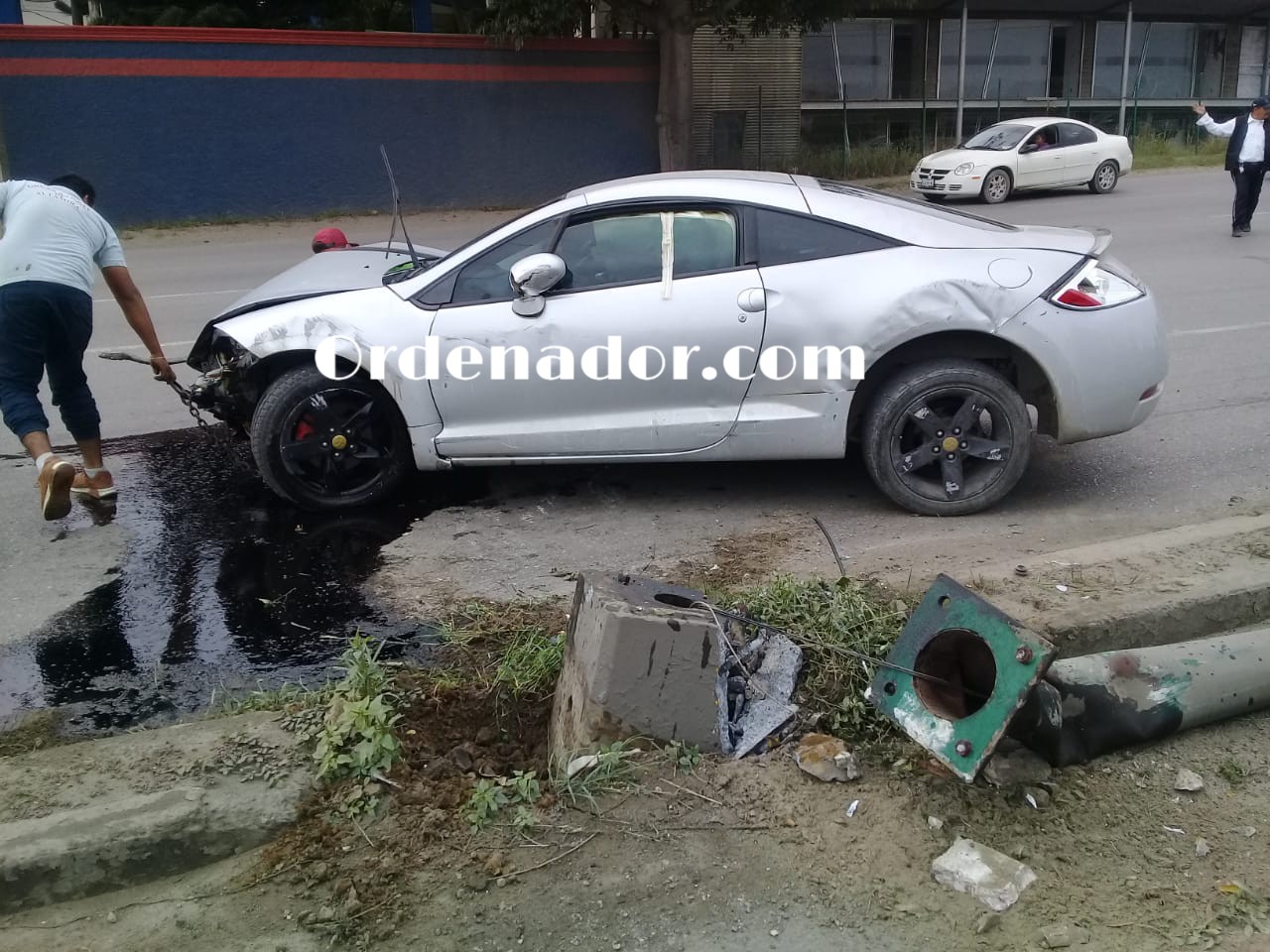 Fue alrededor de las 12:30 horas en el carril de norte a sur de la Avenida de la Industria, en donde un vehículo de la marca Mitsubishi Eclipse en color gris con franja negra terminó por subir al camellón central e impactarse en el poste metálico de alumbrado público que terminó por derrumbarse.