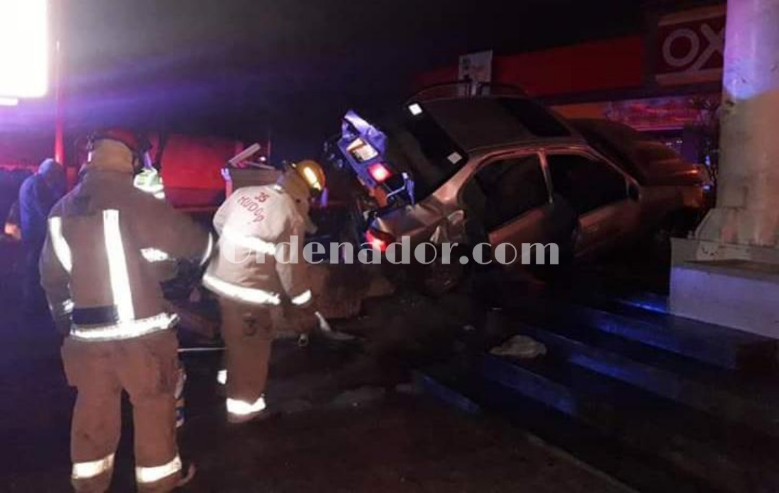 En la proyección, el vehículo quedó “trepado” en una banqueta, además de derribar una barda de un OXXO.