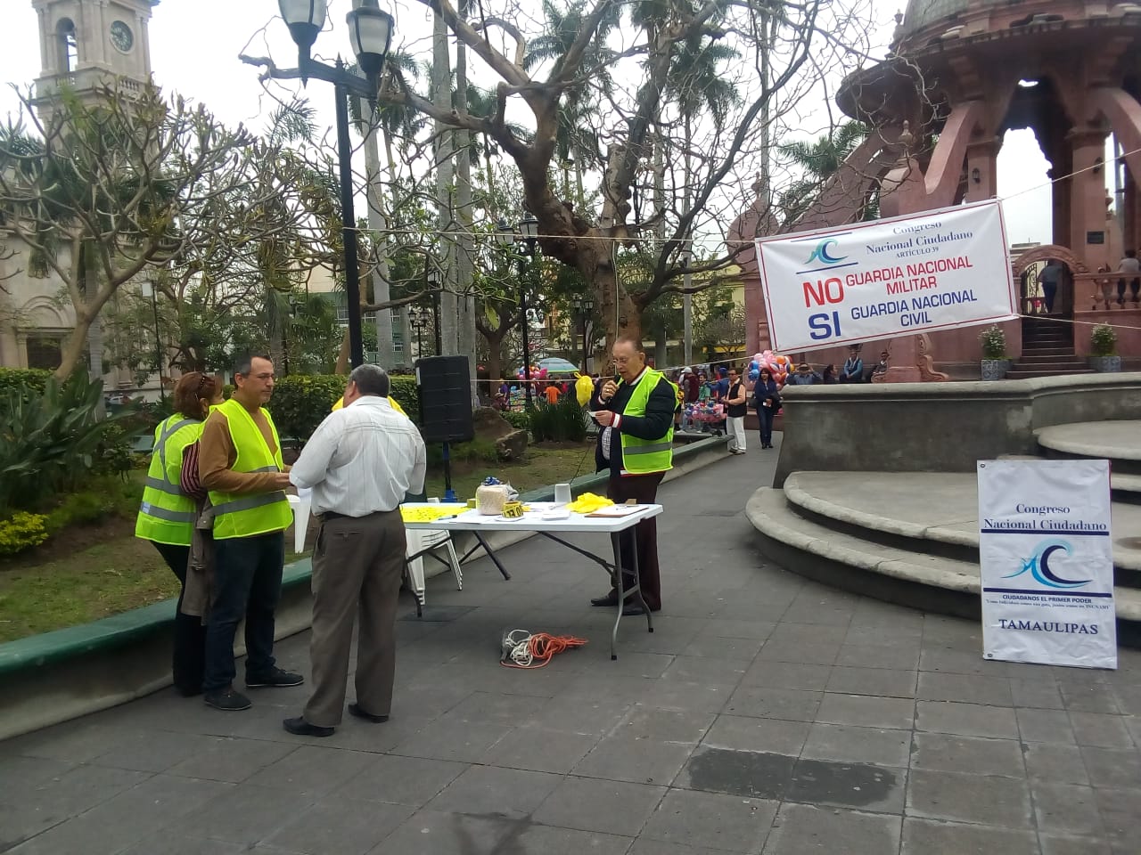 Tampico,Tamps . (26 Enero 2019)grupo perteneciente al Congreso Nacional Ciudadano ataviados con chalecos como los utilizados en Francia en contra del alza al precio de los combustibles; protestó hoy en la plaza de Armas de Tampico en contra de la aprobación de la Guardia Nacional Militar por parte de la Cámara de Diputados.