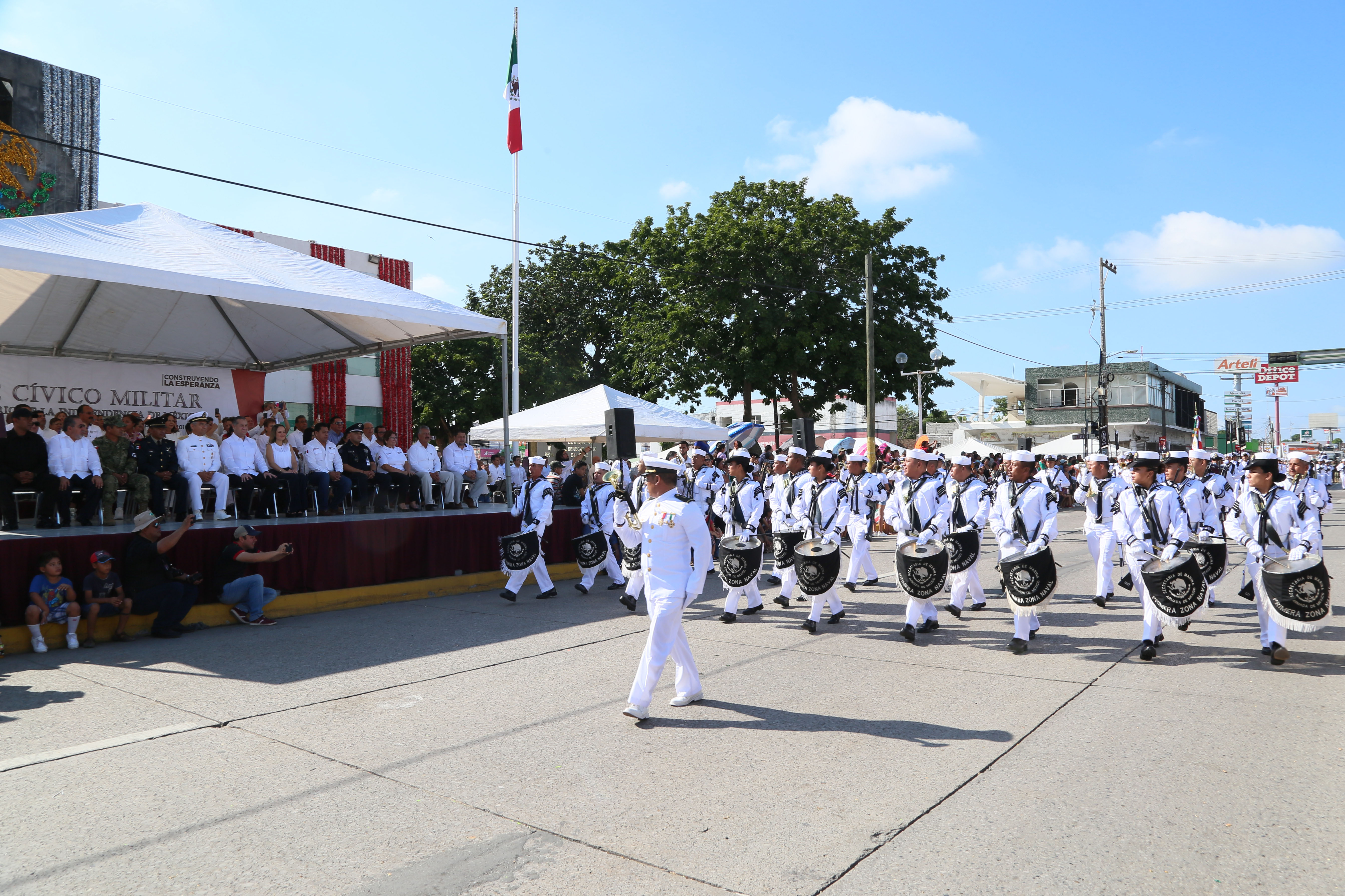 La avenida Álvaro Obregón se engalanó con la marcha de elementos de la Secretaría de Marina (Semar) a través de la Primera Zona Naval, la Guardia Nacional, la Policía Federal, Policía Estatal, Tránsito y Vialidad, Protección Civil, así como 23 contingentes académicos llevando en alto el nombre de su institución.
