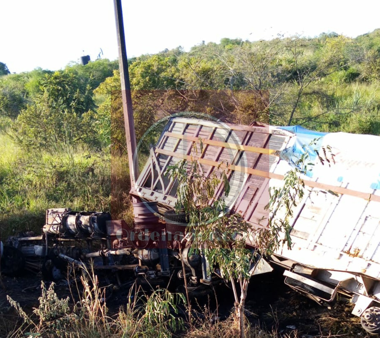 Daños materiales y el susto de su vida se llevó conductor de trailer doble remolque al sufrir aparatosa volcadura e impactarse con un poste, lo que provocó el incendio de la cabina.