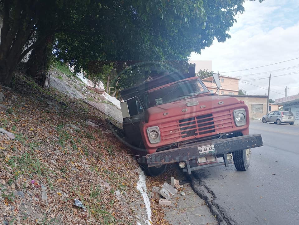 Tampico,Tamps. (4 Noviembre 2021)El susto de su vida se llevó el operador de un camión de volteo cargado con escombro, al sufrir una falla la unidad y apagarse de manera repentina cuando descendía por la bajada Torreón, siendo necesario que el chófer lo detuviera contra el cerro de la colonia Campbell.