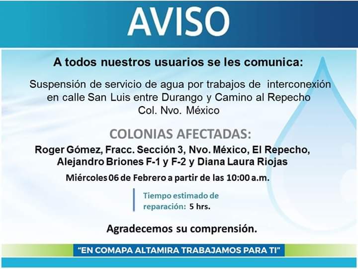 Altamira,Tamps. (5 Febrero 2019)La Comisión Municipal de Altamira informa a todos los usuarios la comisión Municipal de agua potable y alcantarillado sobre la suspensión de servicio de agua por los trabajos de interconexión en la calle San Luis entre Durango y camino al Repecho de la Colonia Nuevo México.