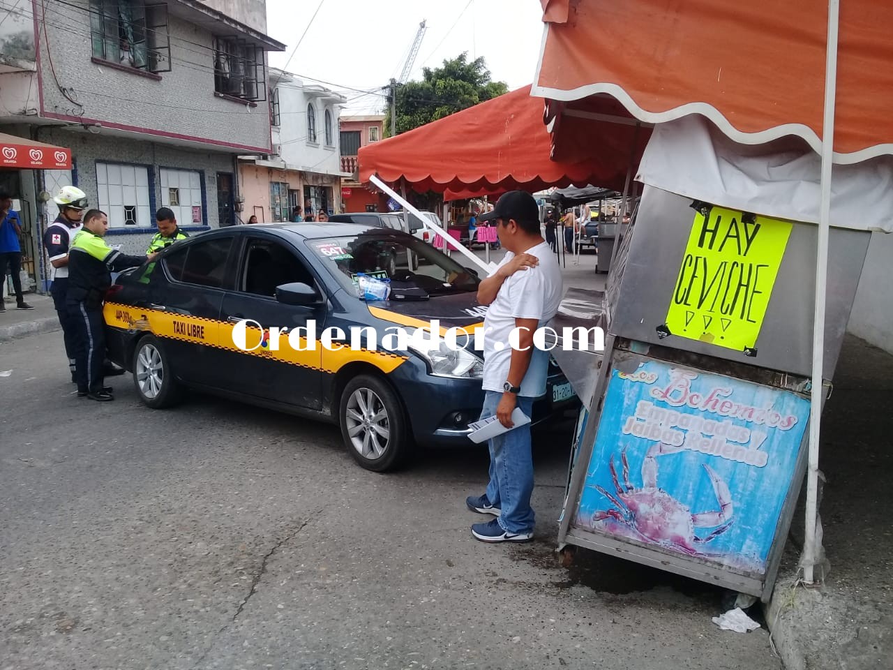 En la intersección su tripulante no hizo alto como le indicaba un señalamiento fijo, impactando a su paso a un taxi que salió proyectado hacia un puesto de venta de marisco, mismo que por fortuna ya se encontraba cerrado.