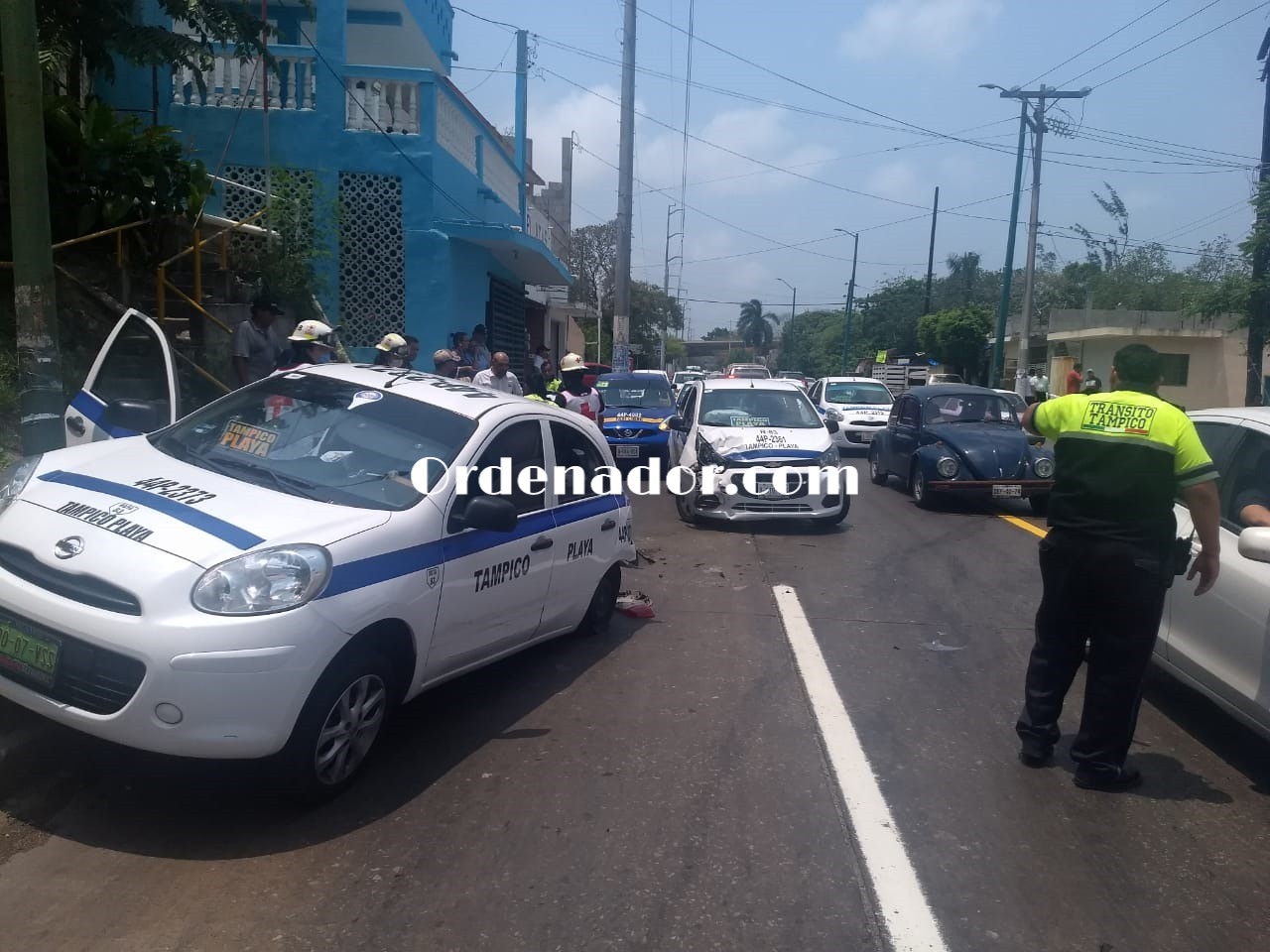 Tampico,Tamps. (22 Mayo 2019)Tres personas heridas y cuantiosas pérdidas materiales, dejó como saldo el aparatoso choque entre dos carros de la ruta Tampico-Playa, incidente provocado por uno de los operadores que circulaba con exceso de velocidad.
