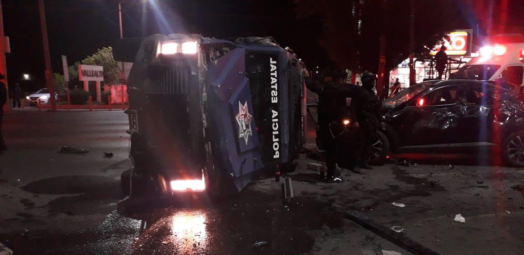 Unidad de Policía Estatal volcada y cuatro vehículos afectados en persecución en Reynosa