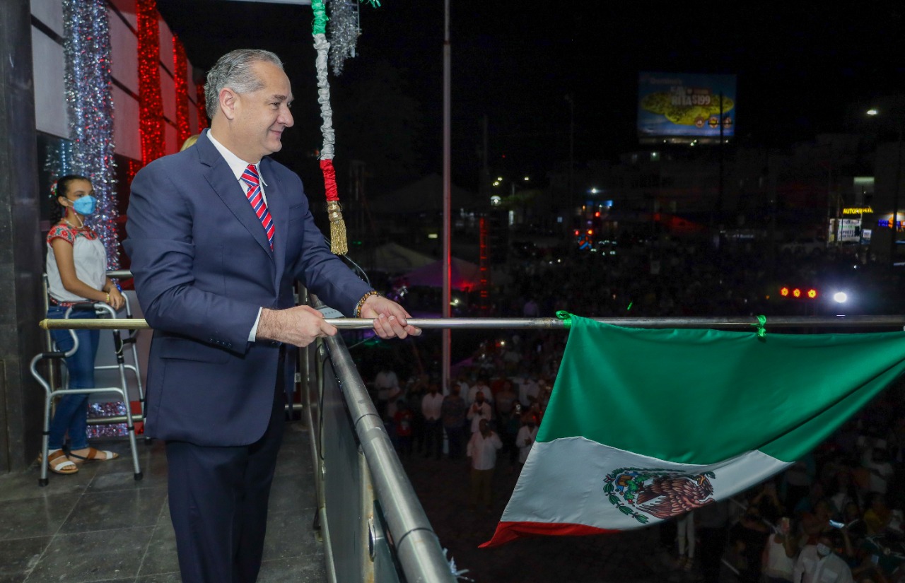 Cd. Madero, Tamps.(15 Septiembre 2022)En Ciudad Madero, un municipio de grandeza y donde se avanza con esperanza, el alcalde Adrián Oseguera Kernion salió al balcón presidencial la noche de este 15 de septiembre para dar el grito que honra a quienes dieron su vida por la Independencia de México y ondear con firmeza la Bandera Nacional en presencia de miles de maderenses.