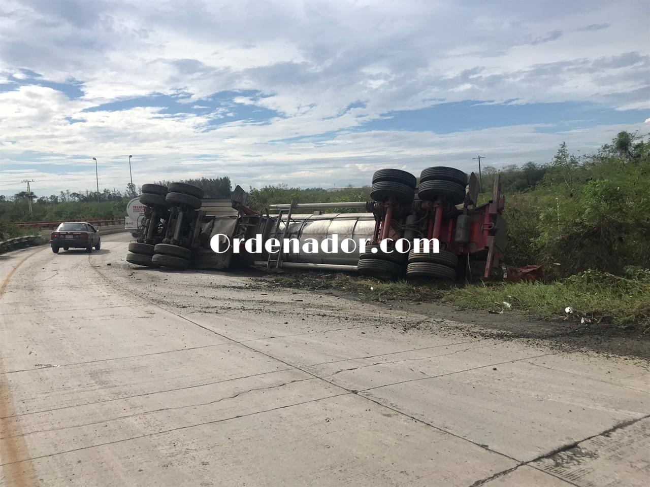 Este percance ocurrió la tarde de este martes en el kilómetro 31 300 del tramo carretero, en donde quedó recostada la pipa cargada con 20 mil litros de jugo de naranja.